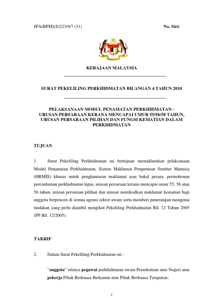 Persaraan kerana mencapai umur 555658 tahun ii. Saya ingin membuat pertanyaan berkenaan status jawatan saya. Pencantuman Perkhidmatan Percantuman perkhidmatan lepas ialah proses mengagregatkan tempoh perkhidmatan sekarang dengan tempoh perkhidmatan.