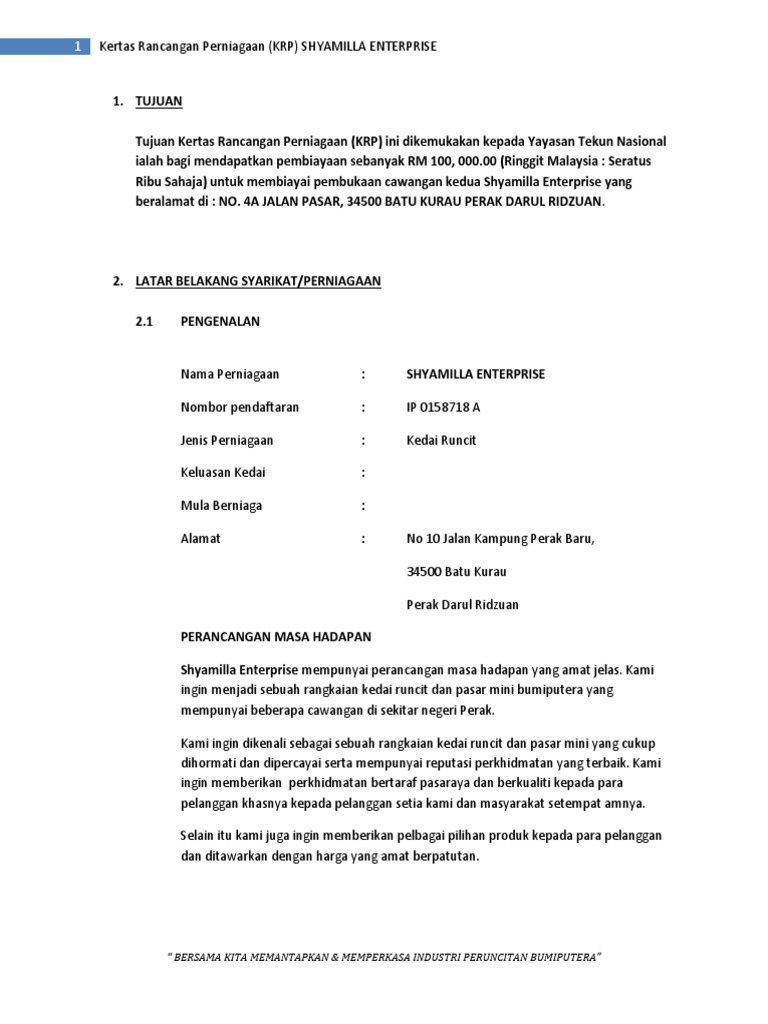 Anda memerlukan kertas kerja pinjaman proposal pinjaman perniagaan yang mudah lulus. Isi kandungan Sesebuah Rancangan Perniagaan Bahagian 1 - Pengenalan Bahagian pertama pengenalan perlu memberi gambaran umum berkaitan bidang.