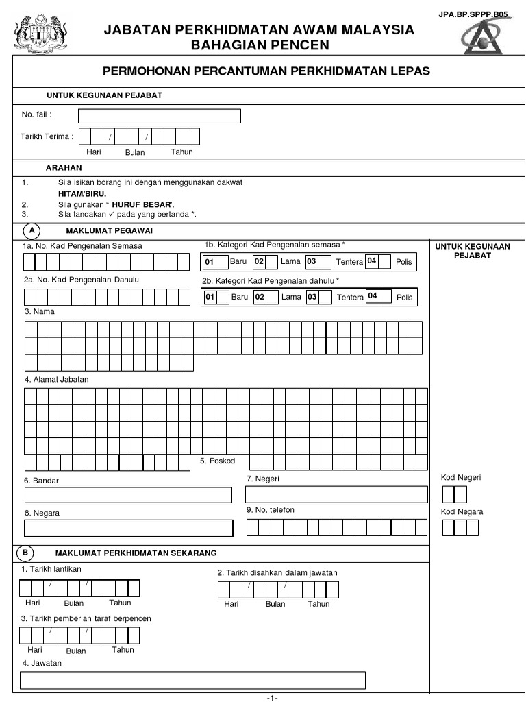 Scribd est le plus grand site social de lecture et publication au monde. Permohonan percantuman perkhidmatan lepas jpa bp sppp b05. Salinan Kenyataan Perkhidmatan dan Kenyataan Cuti bagi perkhidmatan sebelum dan perkhidmatan sekarang.