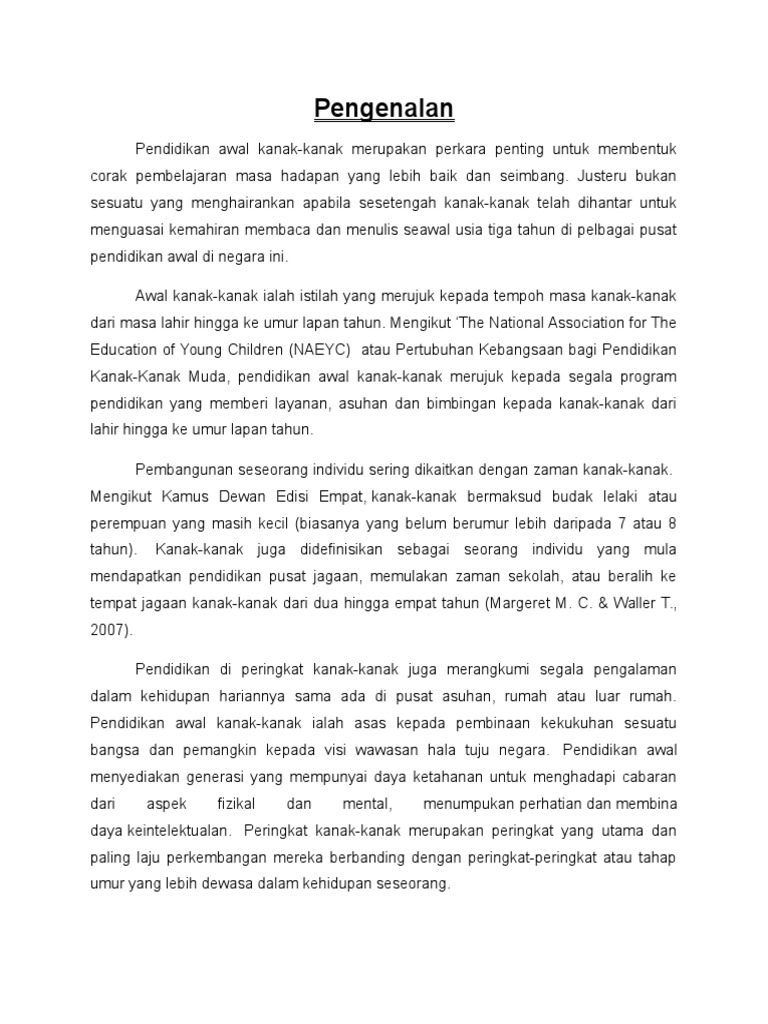 Maksud pendidikan awal kanak-kanak. DASAR PERLINDUNGAN KANAK - KANAK NEGARA PENGENALAN Kanak-kanak merupakan modal insan penting kepada negara. Perkembangan masa kanak-kanak ini terjadi ketika seorang anak memasuki usia 5 sampai 6 tahun atau bila dilihat dari segi pendidikan menempuh pendidikan TK Taman Kanak-Kanak pengetahuan kognitifnya pada masa lkanak-kanak awal masih bersifat subyektif dan kemudian berkembang menjadi obyektif. Modal insan ini dapat dibangunkan kepada tahap optimum melalui penyediaan persekitaran yang selamat dan kondusif.